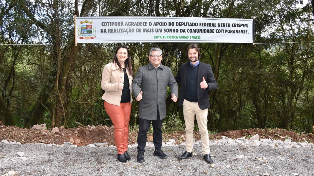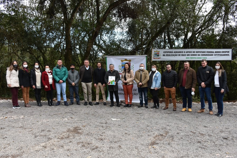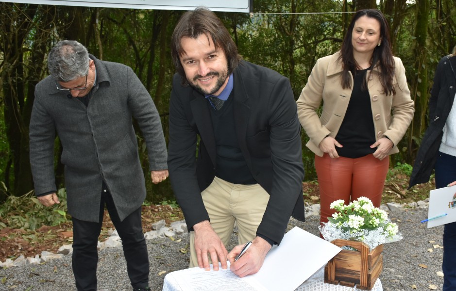 Na oportunidade, o Prefeito Ivelton Mateus Zardo, Vice-Prefeita Lenita Zanovello Tomazi, Presidente da Rota Turística e Secretária de Turismo e Cultura, Patrícia Gabriel, demais secretários, Presidente da Câmara de Vereadores, Ivaldino Frizon, demais vereadores e servidores públicos, juntamente ao Deputado Nereu e autoridades regionais, realizaram a Assinatura da Ordem de Início das Obras de pavimentação de mais dois quilômetros da via, que contam com recursos provenientes do Deputado Nereu Crispim.