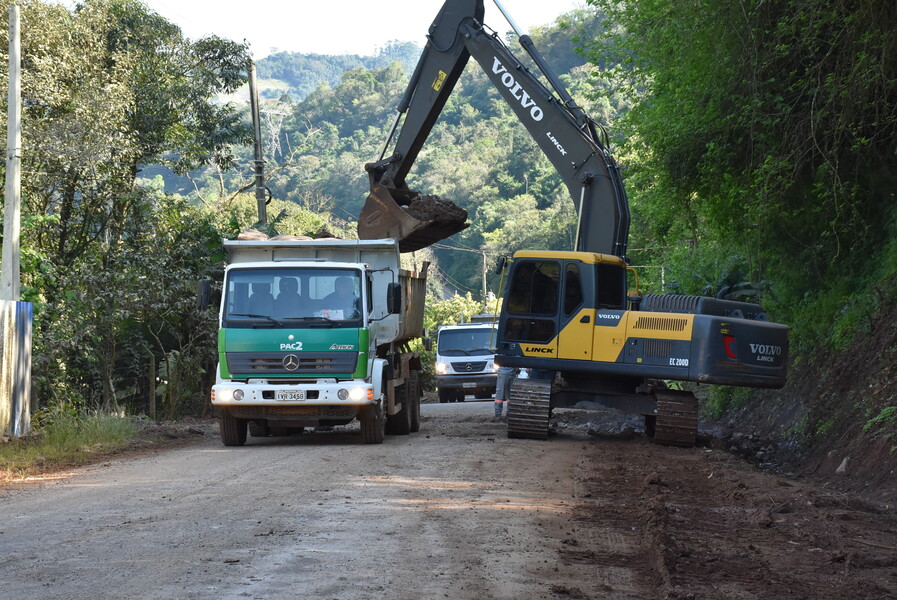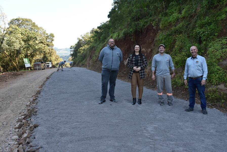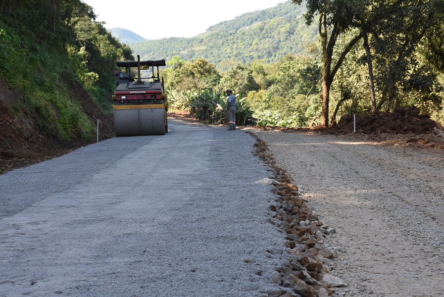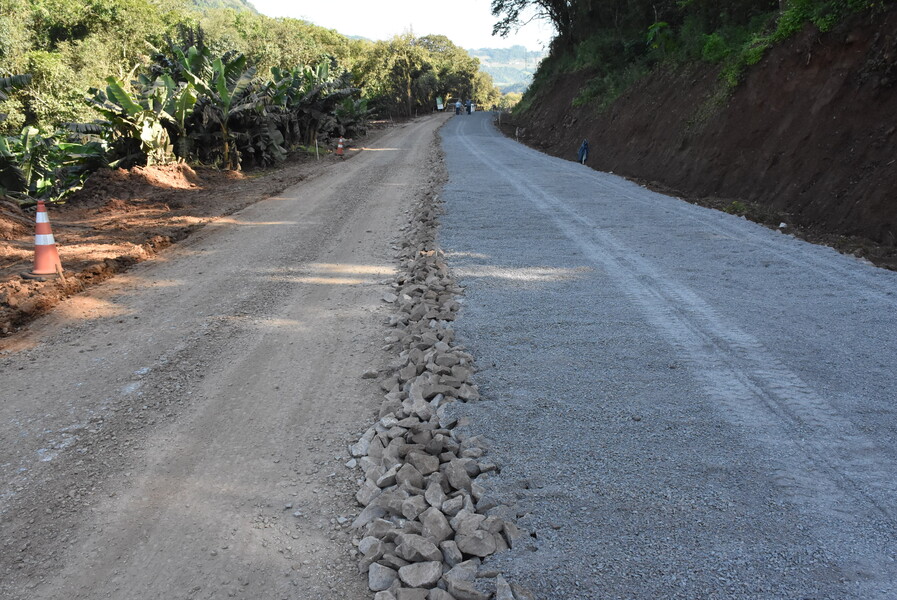 A Secretaria Municipal de Obras está finalizando os trabalhos de limpeza e reforço das laterais da via, enquanto a empresa Concresul executa a construção da camada de macadame (base) que posteriormente receberá a camada asfáltica.
