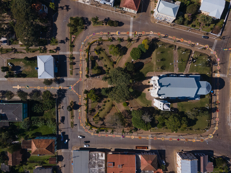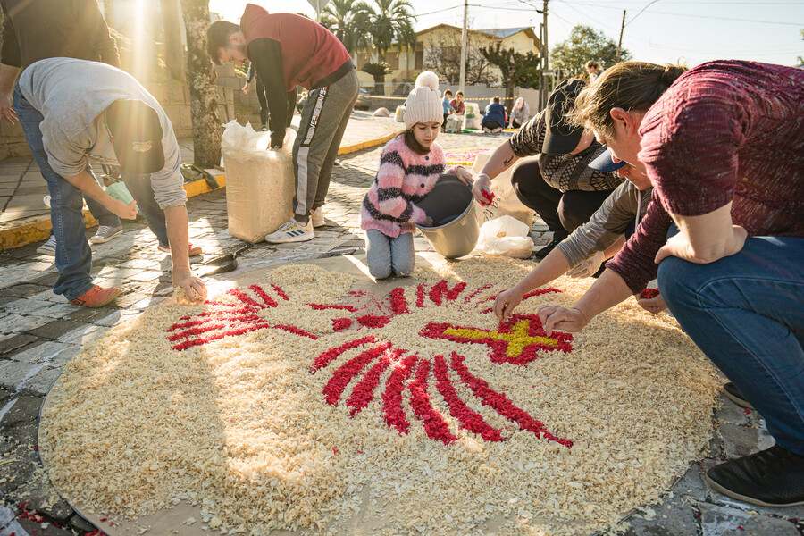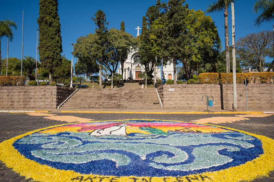 125 tapetes cobrem as ruas da Praça Maurício Cardoso em formato de terço. Para isto, muitas foram as mãos dedicadas, minuciosas e colaborativas, que mais uma fez fizeram acontecer um feito tão lindo como este, sendo destaque por sua grandiosidade.