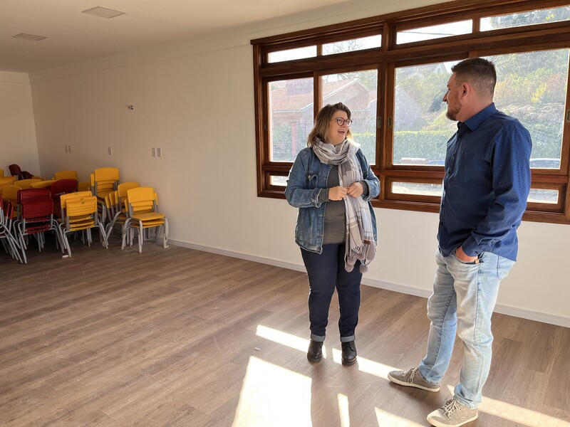 Neste momento, a Diretora Marina Giordani Titton o acompanhou, mostrando e explicando a grande obra do Berçário, que está em suas fases finais.