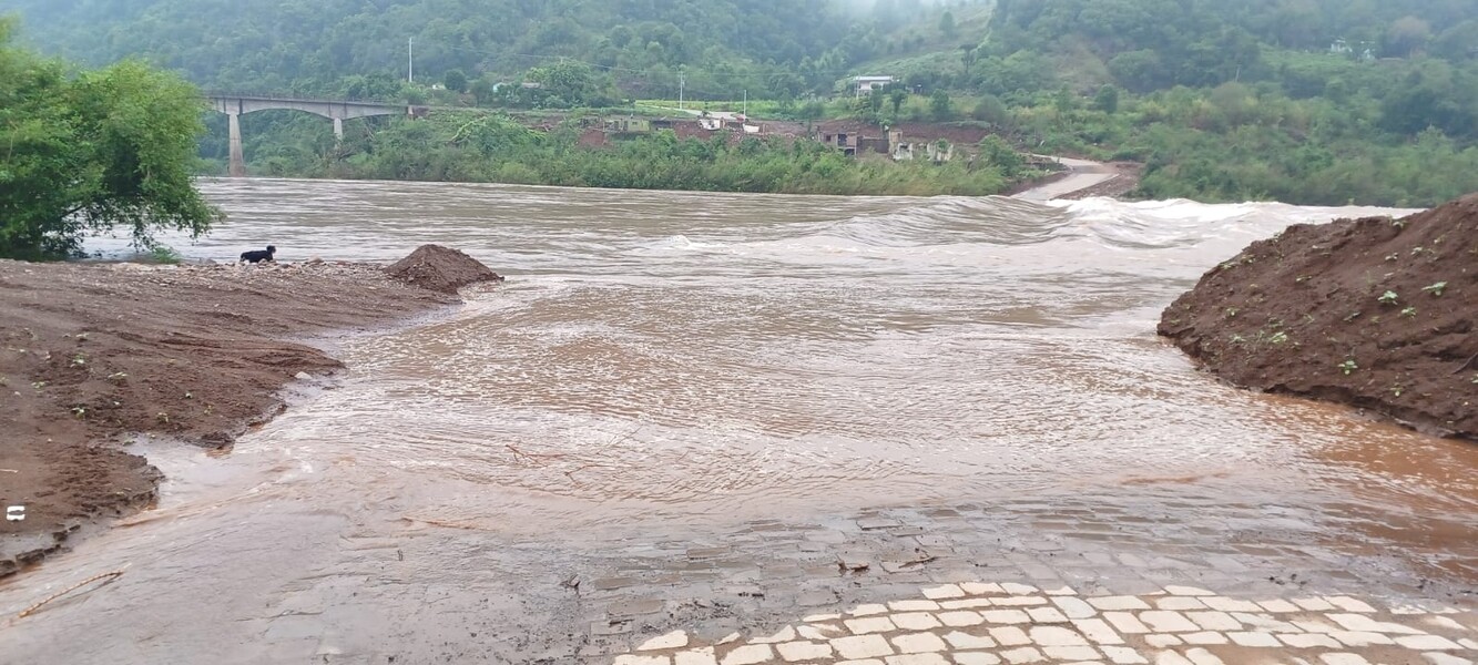 Pela segunda vez na semana, o nível da água submergiu a ponte, não sendo possível passar! No momento, o volume do Rio segue aumentando.