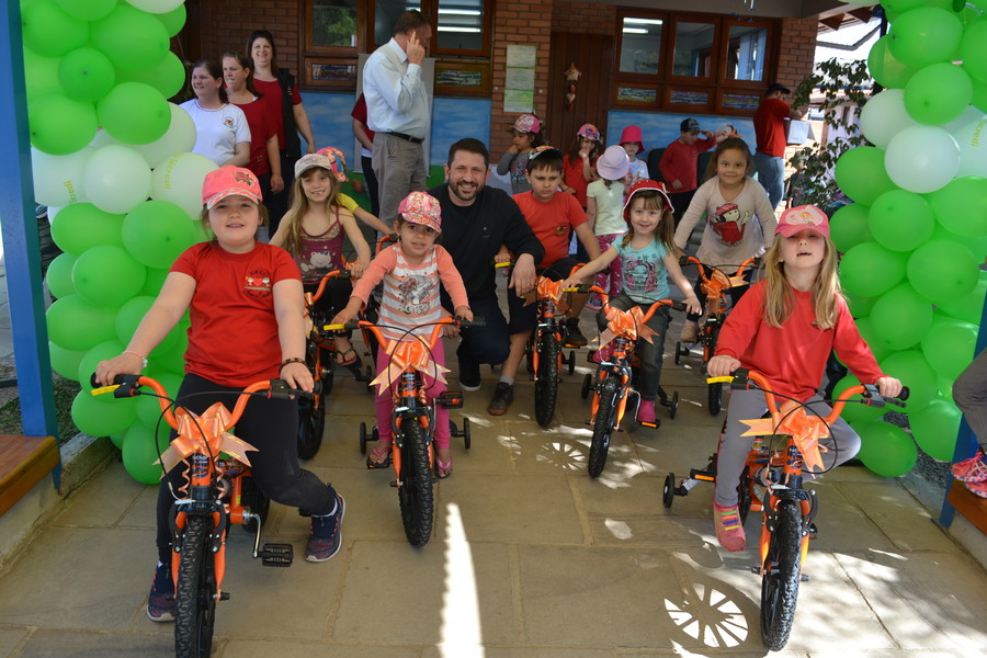 Na última quarta-feira, dia 25 de setembro, profissionais e alunos da Escola Municipal de Educação Infantil Amor e Carinho foram presenteados pela Cooperativa Sicredi, com oito bicicletas, conquistadas através do projeto inscrito no Fundo Social “Aprender e brincar na mesma Pedalada”.