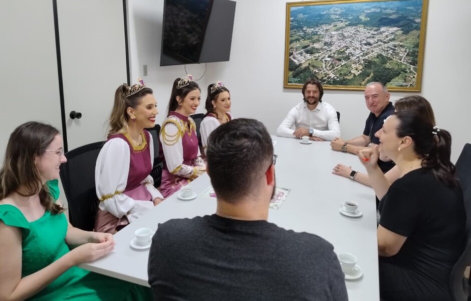 O Prefeito Ivelton, a Vice-prefeita Lenita, o Secretário de Turismo e Cultura Thomas e a Secretária de Administração Joana receberam a Corte da 8ª Festa de Abertura da Vindima, Rainha Giovanna Bombassaro e das Princesas Daiana Picoli Lovisa e Alexia Pilonetto, acompanhadas pelo Secretário de Turismo de Monte Belo do Sul, Álvaro Manzoni.