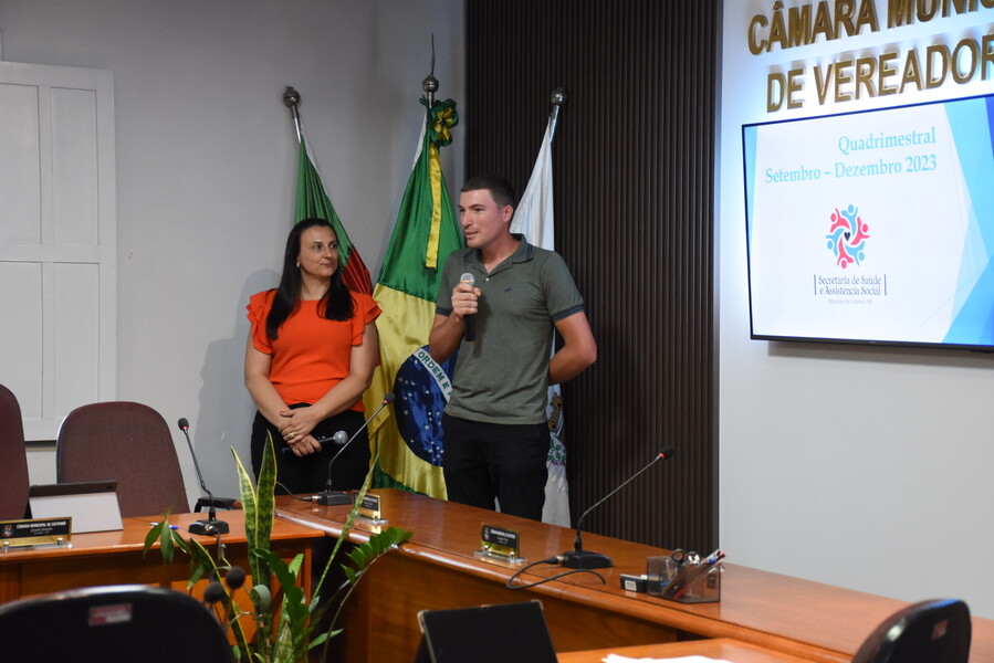 Após, a Secretária de Saúde e Assistência Social Rozeli Frizon realizou a apresentação do Relatório Quadrimestral da Saúde e em seguida a Secretária da Fazenda Elisandra Scussel apresentou a avaliação do cumprimento de Metas Fiscais.
