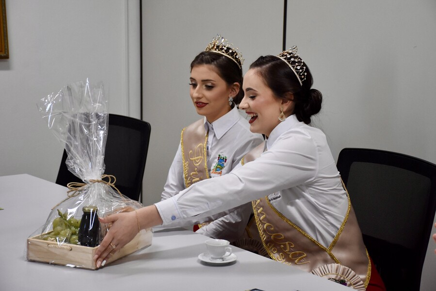 A Soberanas, Princesas Eduarda Baggio e Raíssa Filippi Chiella, juntamente com a Vice-presidente da festa Kelen e da representante da Comissão Social Sibeli, realizaram o convite no Centro Administrativo, junto à Prefeita em Exercício Lenita Zanovello Tomazi, à Secretária de Administração em Exercício Daiane Nicolao Rebelato e à Coordenadora de Turismo Bárbara Roberta Scarton.