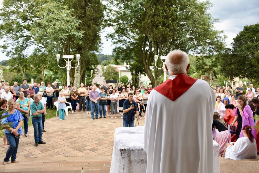 Grande público se fez presente na Praça Maurício Cardoso, em frente à Igreja Matriz, para acompanhar esta ocasião única do calendário religioso, reforçando sua importância para Cotiporã.