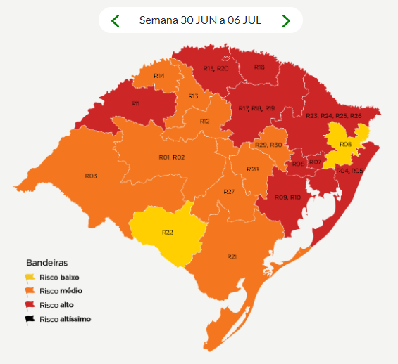 No final da tarde de hoje, 26 de junho, o Governo do RS anunciou mudanças na classificação das cores de bandeiras para as regiões do Estado. A região de Caxias de Sul, que conta com 49 municípios, poderá retornar para a bandeira vermelha na próxima terça-feira (30).