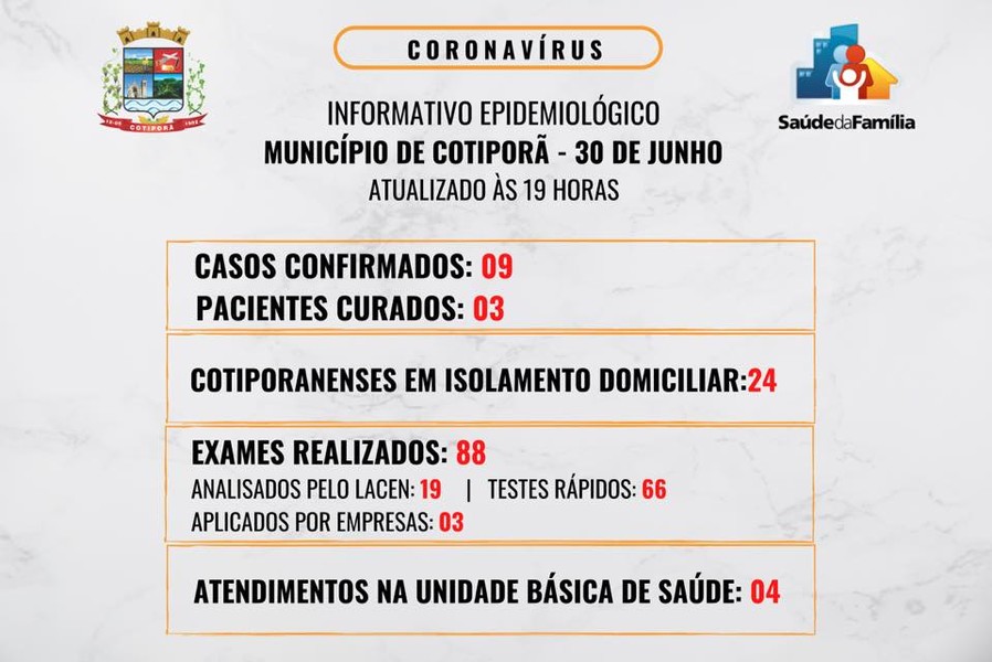 Município de Cotiporã encerra o mês de junho com 9 casos confirmados da Covid-19, sendo 3 considerados curados e 6 casos ativos.
