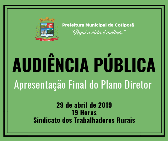 No dia 29 de abril, será realizada Audiência Pública para apresentação final do Plano Diretor de Cotiporã. O Plano Diretor Municipal é o instrumento básico para orientar a política de desenvolvimento do município, buscando garantir a qualidade de vida da população, preservação do meio ambiente, incentivo a criação de oportunidades de emprego e renda e fomentação da mobilidade urbana sustentável. Trata-se de um mecanismo de suma importância que possibilita um planejamento futuro da cidade.