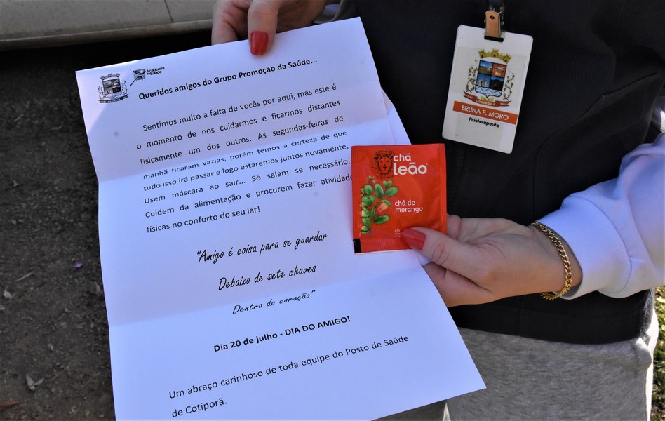 Hoje, 20 de Julho, é comemorado o Dia Internacional da Amizade. Buscando celebrar a data e transmitir o sentimento de carinho e saudades, a Administração Municipal, através da Secretaria de Saúde e Assistência Social, realizou na manhã de hoje, a entrega de um mimo para os cotiporanenses que participam do Grupo “Promoção da Saúde”. Os cotiporanenses foram presenteados com um cartão que continha dicas de saúde e cuidados preventivos a Covid-19, bem como um sachê de chá.