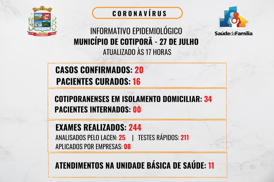 Dos cinco cotiporanenses positivados na data de hoje, 4 foram confirmados através de testes rápidos, sendo todos familiares de casos já ativos, e 1 através de exame laboratorial por empresa local. Todos os casos já cumpriam o isolamento domiciliar com seus familiares.