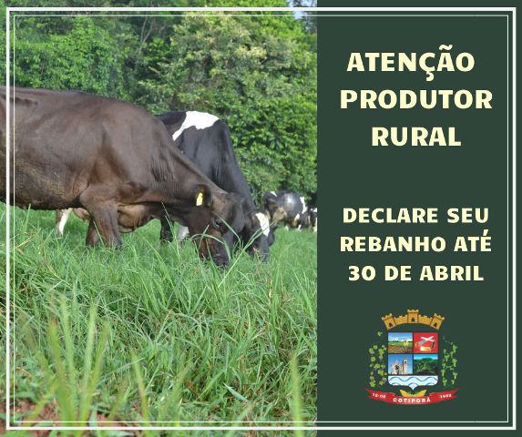 A Prefeitura Municipal através da Inspetoria Veterinária informa aos produtores rurais que a Declaração Anual de Rebanho 2019 poderá ser preenchida e entregue até dia 30 de abril deste ano.