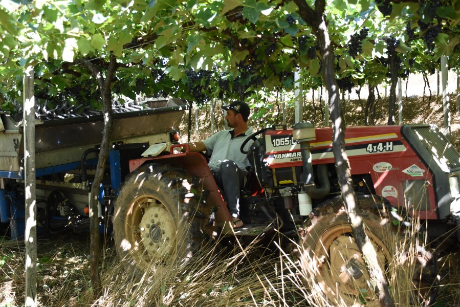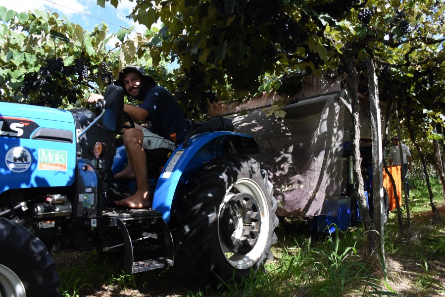 Já na propriedade de Edemilson Girardi e família, em Lajeado Bonito, 05 hectares de uva recebem o sistema de colheita mecanizada. As variedades colhidas pela máquina são BRS Magna, Bordô, Isabel Precoce e Couderc. A família Girardi pretende, em torno de 02 anos, adaptar todos hectares de uva para o sistema mecanizado.
