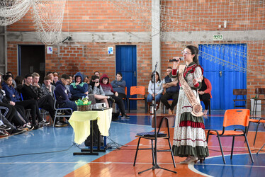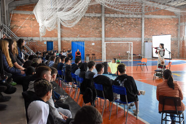 As turmas do Ensino Médio da E.E.E.M. Prof. Jacintho Silva e do Ensino Fundamental Anos Finais da E.M.E.F. Caminhos do Saber participaram de palestra com a 3ª Prenda Juvenil do Rio Grande do Sul Amanda Bissani Tonial, sobre o Dia do Gaúcho, a importância das nossas tradições e o tema Festejos Farroupilhas, que em 2024 é “O centenário de Jayme Caetano Braun”.