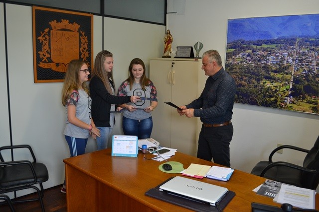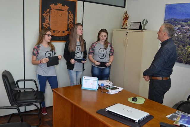 Na manhã de hoje (28), o Prefeito Municipal José Carlos Breda e o Vice Prefeito Ivaldo Wearich receberam a visita dos representantes da turma do 9º ano da Escola Municipal de Ensino Fundamental Caminhos do Saber.