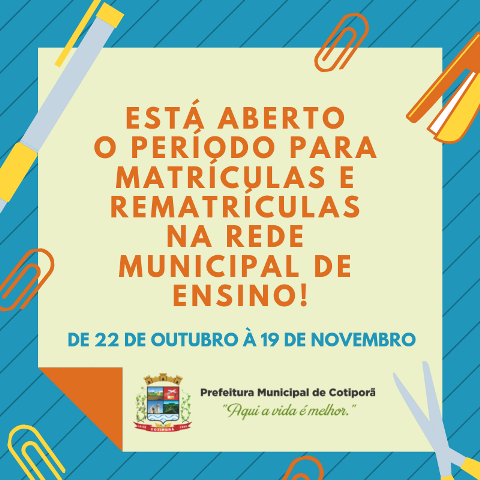 Estende-se até o dia 19 de novembro o período para efetivação das matrículas e rematrículas nas Escolas Municipais de Cotiporã. A confirmação deverá ser feita na própria escola pelos responsáveis do aluno, mediante apresentação do RG e CPF.