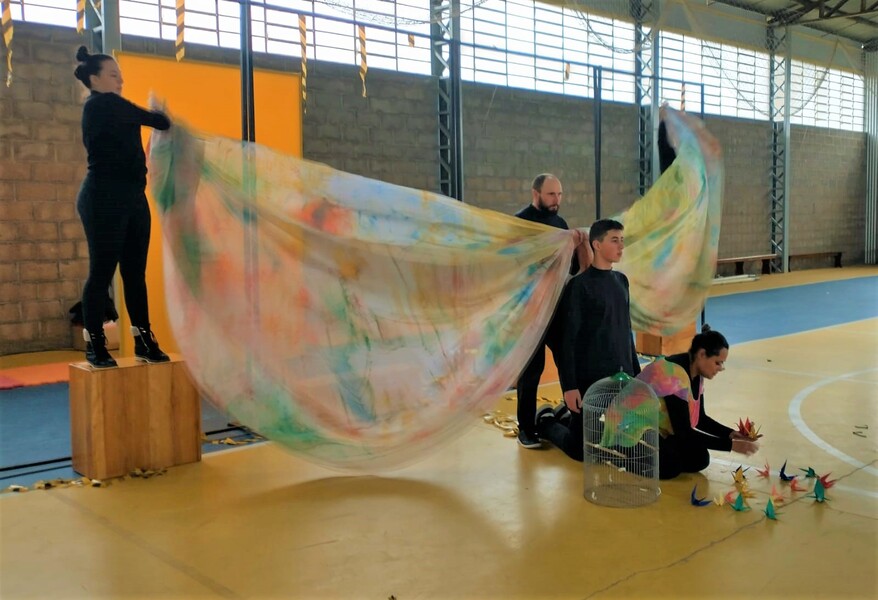 Através do espetáculo “Sobre Asas de Papel”, o grupo Arte in Cena propôs uma reflexão sobre o que move ou aprisiona professores e alunos nas escolas, destacando o papel fundamental de professores e pais, como aqueles que encorajam, inspiram o voo, a transposição de obstáculos em busca da realização e concretização dos sonhos.