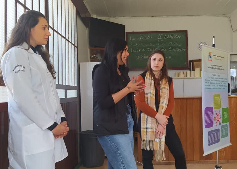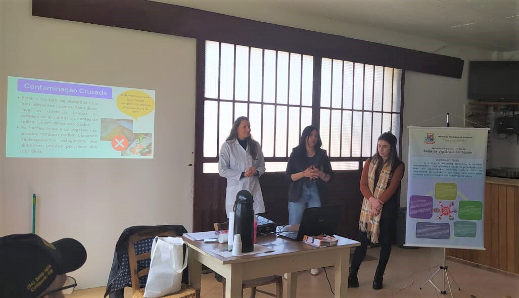 As profissionais da Secretaria de Saúde e Assistência Social de Cotiporã, Fiscal Sanitária Bárbara Costa, Nutricionista Aline Cenci e a Biomédica Rafaela Breda, realizaram, na última semana, o 3º encontro da capacitação “Cardápio Seguro” - Boas Práticas com Alimentos.