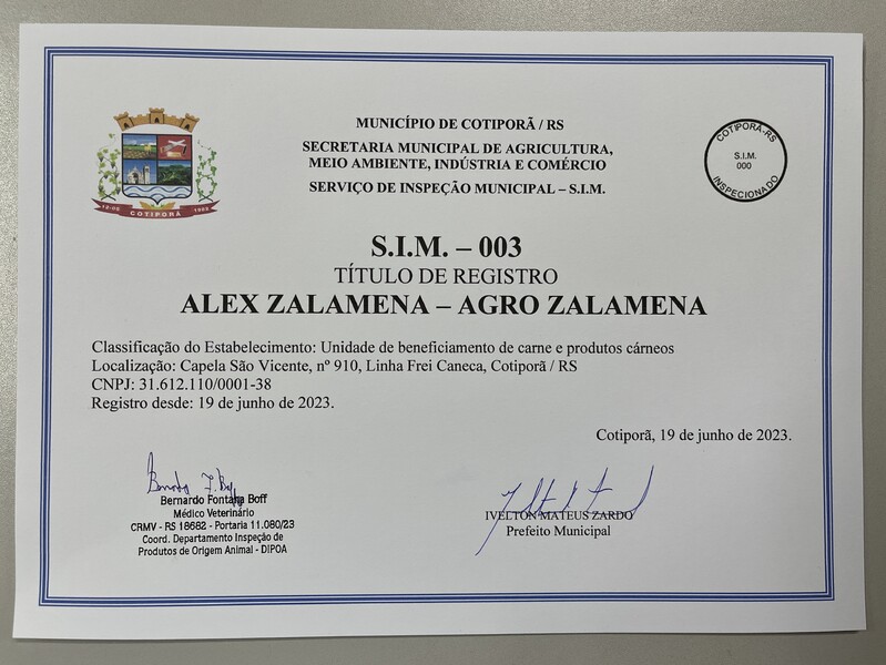 Na ocasião, foi conferido o Título de Registro da Agroindústria aos representantes da Agro Zalamena, Alex Zalamena e Leila Cardoso. Eles receberam o aval do Serviço de Inspeção Municipal para trabalharem com beneficiamento de carne e produtos cárneos (produção de banha e torresmo).