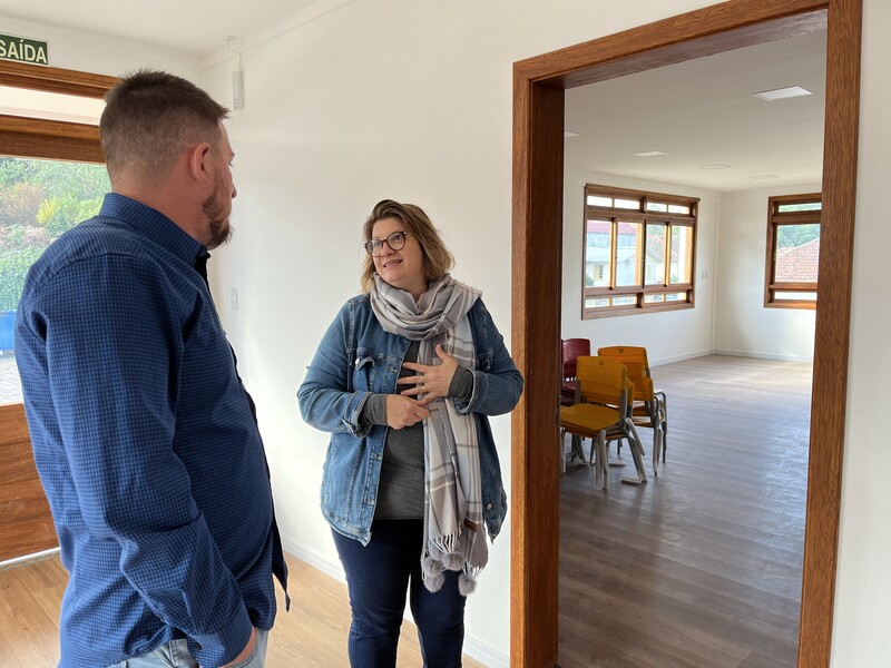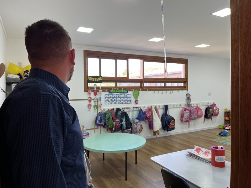 Neste momento, a Diretora Marina Giordani Titton o acompanhou, mostrando e explicando a grande obra do Berçário, que está em suas fases finais.