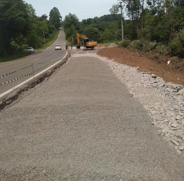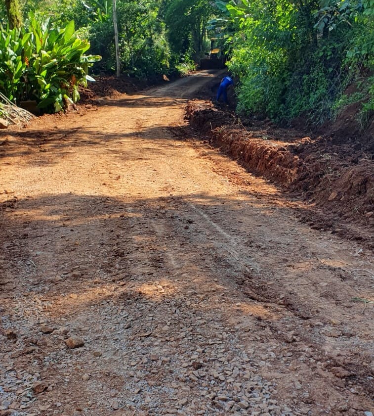 Em relação às pavimentações, foi concluído o trabalho de terraplenagem, reforço do sub-leito e camada de pedrisco necessário a pavimentação do refúgio de acesso as comunidades de Santos Anjos, Pedancino e Lageado Bonito e segue em ritmo acelerado a pavimentação de mais um trecho da Rua Clemente Guindani.