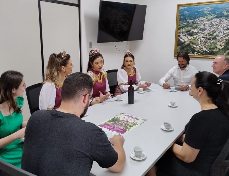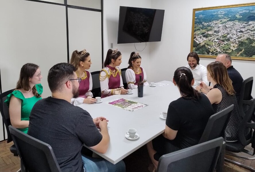 O Prefeito Ivelton, a Vice-prefeita Lenita, o Secretário de Turismo e Cultura Thomas e a Secretária de Administração Joana receberam a Corte da 8ª Festa de Abertura da Vindima, Rainha Giovanna Bombassaro e das Princesas Daiana Picoli Lovisa e Alexia Pilonetto, acompanhadas pelo Secretário de Turismo de Monte Belo do Sul, Álvaro Manzoni.