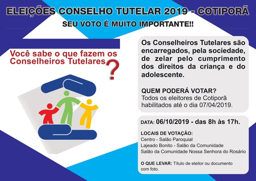 O mandato de Conselheiro Tutelar é de 4 anos e neste ano haverá a eleição unificada em todo o país, a qual ocorre neste domingo, dia 6 de outubro das 8 às 17 horas. As urnas para votação estarão disponíveis em Cotiporã, na Comunidade de Lajeado Bonito, Salão Paroquial e na Comunidade de Nossa Senhora do Rosário. Poderão votar os eleitores cotiporanenses habilitados até o dia 07 de abril de 2019.