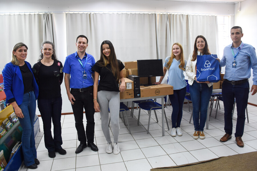 Na manhã de hoje (12), representantes do Banco do Rio Grande do Sul deixaram 9 computadores na Escola Municipal de Ensino Fundamental Caminhos do Saber.