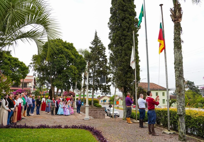 No dai 20 de setembro, Cotiporã manteve viva a tradição gaúcha com mais uma programação farroupilha na Praça Matriz. Autoridades, entidades e comunidade participaram do hasteamento das bandeiras, da entoação dos hinos Nacional e Rio-Grandense e da bênção conduzida pelo padre Gilberto Lazzarotto, culminando na extinção da Chama Crioula.