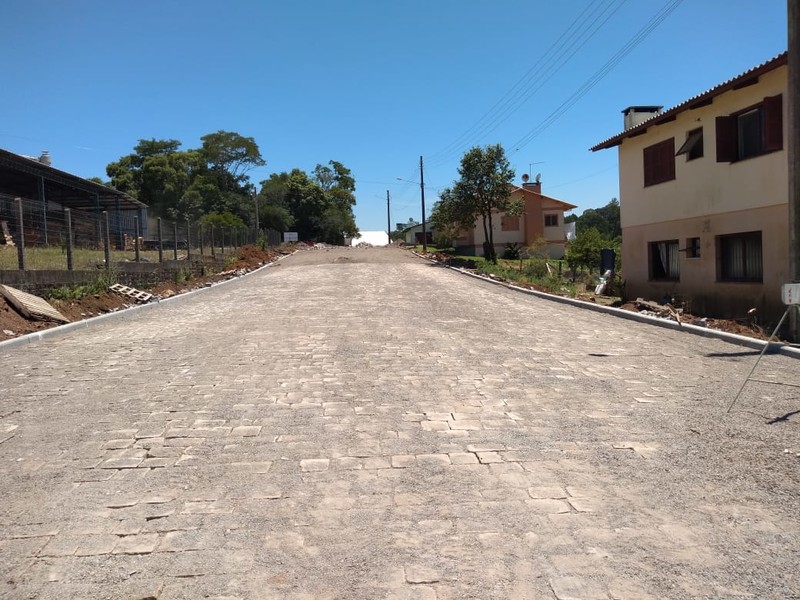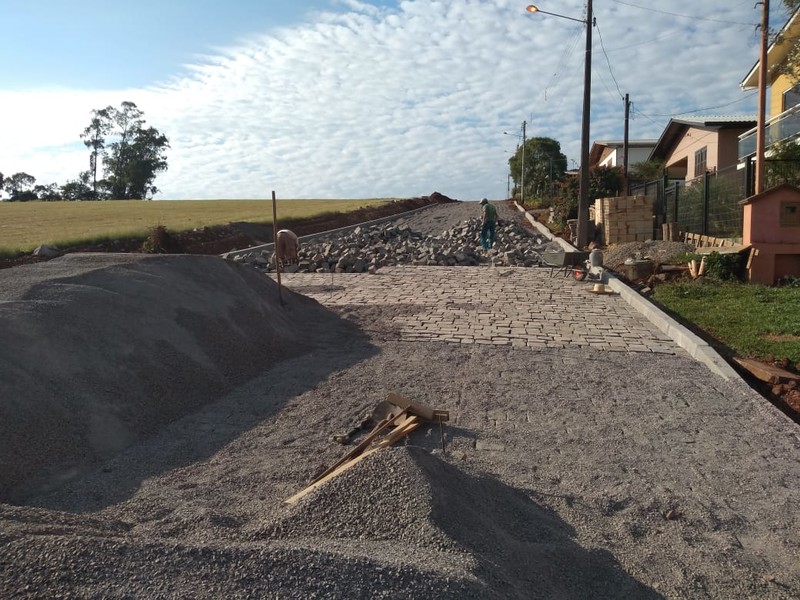 Já no centro do município, seguem os serviços de pavimentação em paralelepípedos das Ruas Prudente de Moraes e Norberto David Paludo.