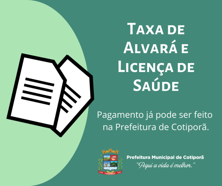 A Prefeitura de Cotiporã através da Secretaria da Fazenda informa que está aberto o período para pagamento da Taxa de Licença de Localização (TLL), também conhecida como taxa de Alvará e da Taxa de Licença de Saúde (TLS). O mesmo se estende até o dia 31 de janeiro de 2020.