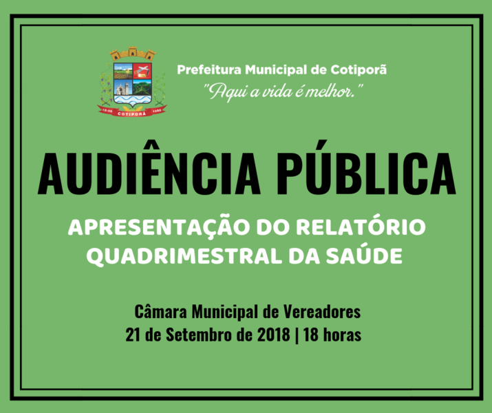 Como forma de transparência e para dialogar com a população, será realizada hoje, 21 de setembro, audiência pública para apresentação do Relatório Quadrimestral da Saúde, relativo ao segundo quadrimestre de 2018.