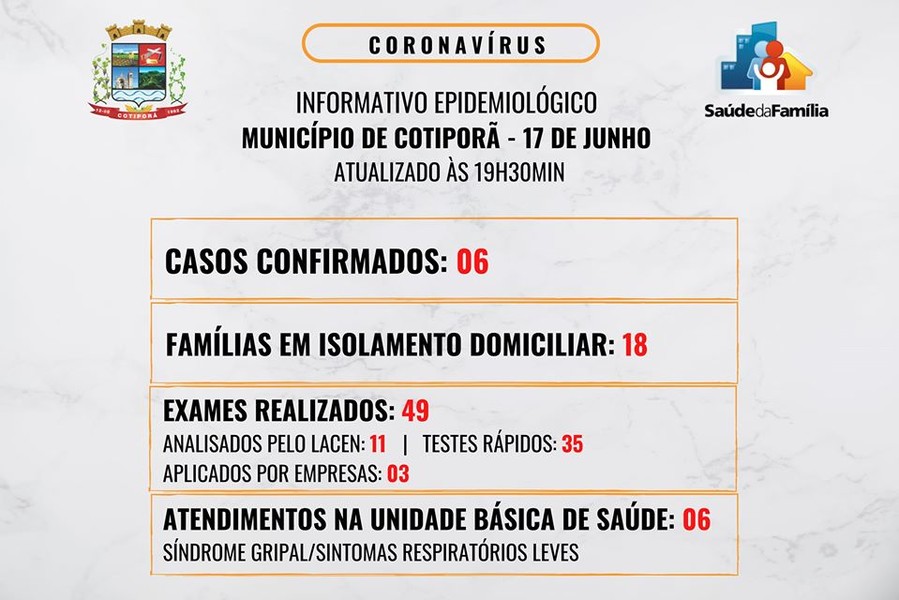 Todos pertencem à mesma família dos três primeiros casos confirmados no Município e estão em isolamento domiciliar com seus familiares, sendo monitorados pela equipe de saúde via contato telefônico.
