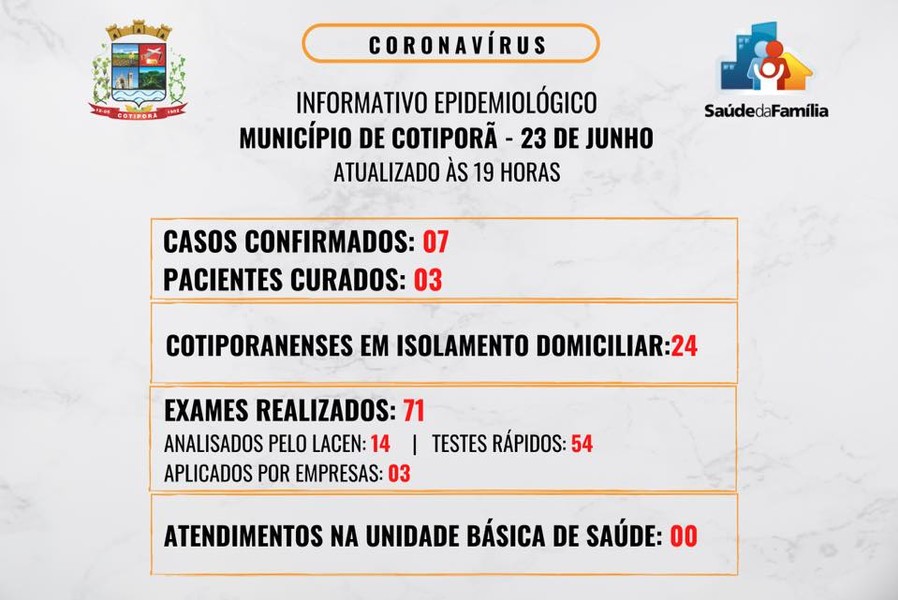 O município segue com 7 casos confirmados, sendo 3 considerados curados e 4 ativos.