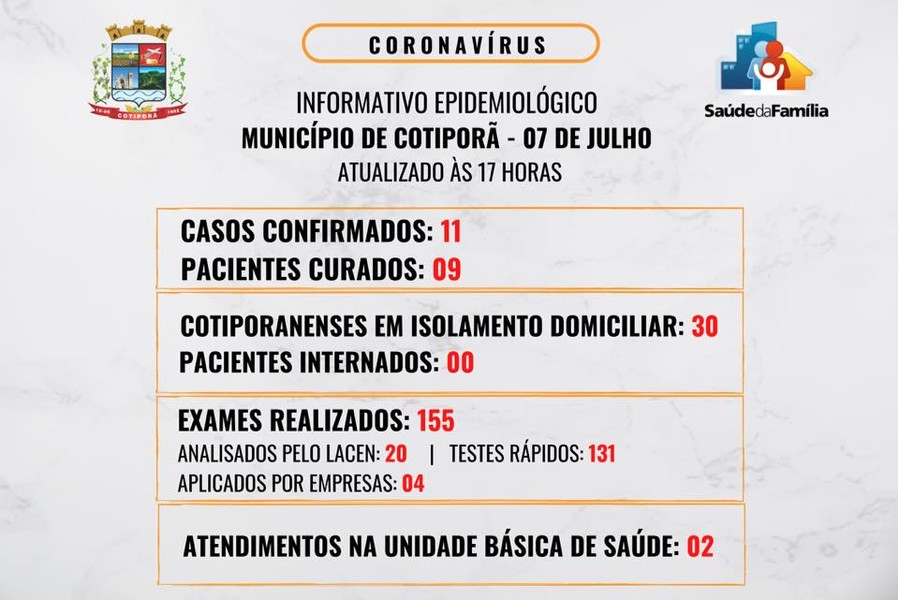 O informativo epidemiológico, atualizado após as 17 horas, contém os dados registrados pela Unidade de Saúde até as 16h30min. Os atendimentos e exames realizados no turno da noite, são atualizados no boletim do dia seguinte.