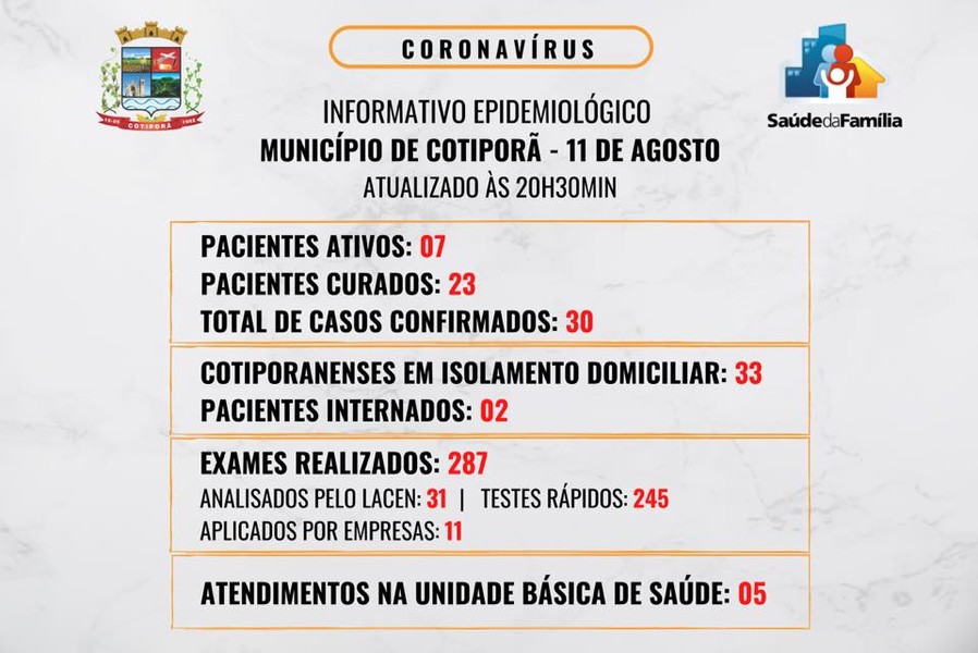 Com isso, o município chega aos 30 casos confirmados do Coronavírus, sendo que 23 pacientes já estão curados da doença.
